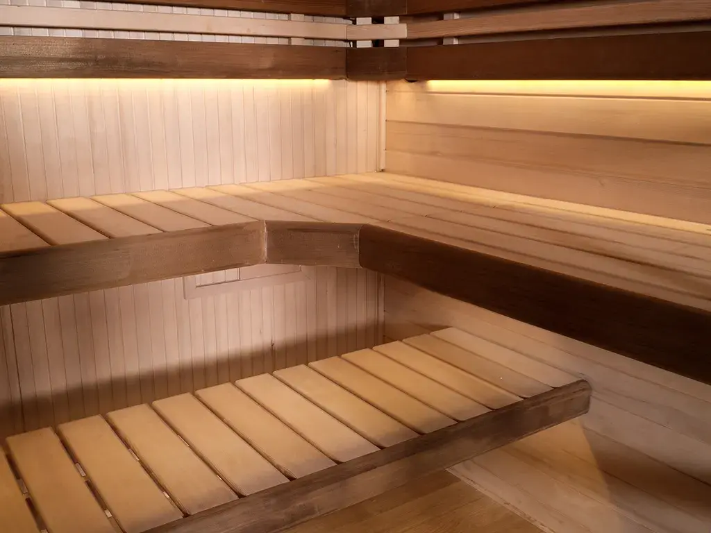 Interior is draped in Aspen wood, renowned for its beauty and resistance to heat. Seamless joinery, VOC-free finishes, and a smoked full glass front offer a luxurious heat bathing experience.