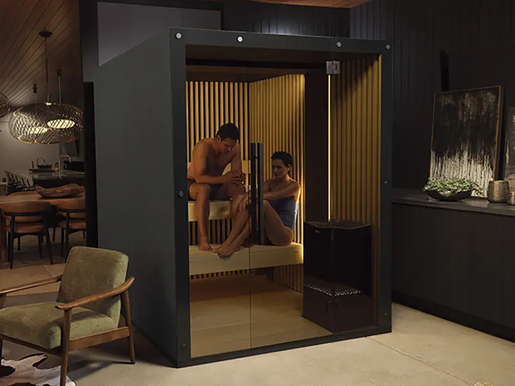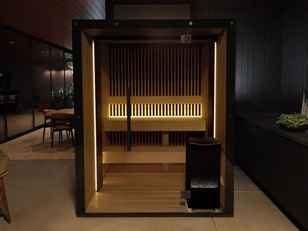 Interior is draped in Aspen wood, renowned for its beauty and resistance to heat. Seamless joinery, VOC-free finishes, and a smoked full glass front offer a luxurious heat bathing experience.